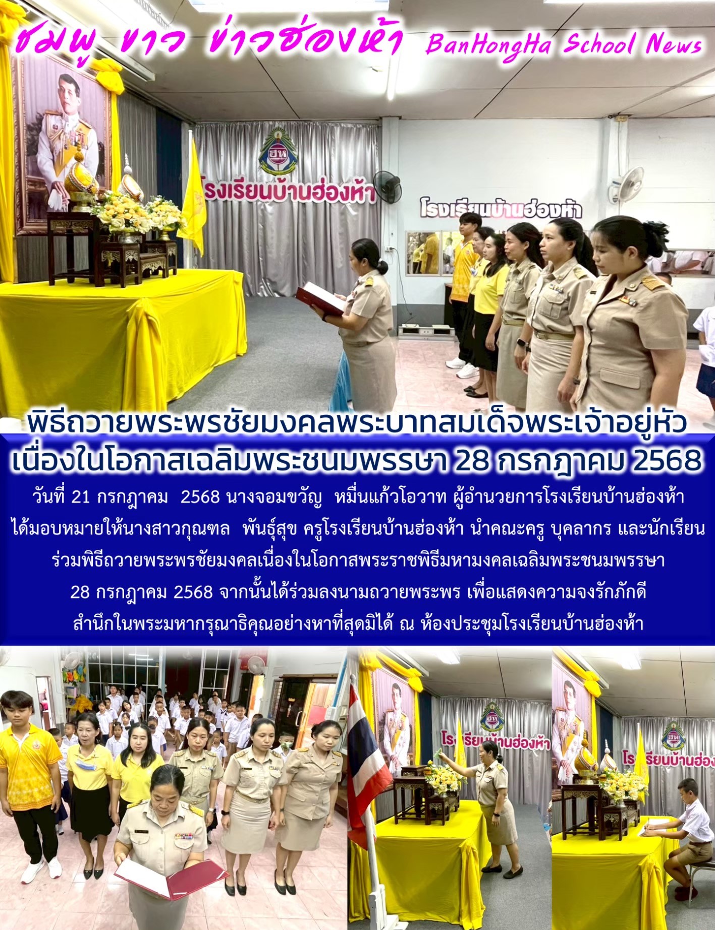 พิธีถวายพระพรชัยมงคลพระบาทสมเด็จพระเจ้าอยหัว เนื่องในโอกาสเฉลิมพระชนมพรรษา 28 กรกภาคม 2568 วันที่ 21 กรกฎาคม 2568 นางจอมขวัญ หมื่นแก้วโอวาท ผู้อำนวยการโรงเรียนบ้านฮ่องห้า ได้มอบหมายให้นางสาวกุณฑล พันธุ์สุข ครูโรงเรียนบ้านฮ่องห้า นำคณะครู บุคลากร และนักเรียน ร่วมพิธีถวายพระพรชัยมงคลเนื่องในโอกาสพระราชพิธีมหามงคลเฉลิมพระชนมพรรษา 28 กรกฎาคม 2568 จากนั้นได้ร่วมลงนามถวายพระพร เพื่อแสดงความจงรักภักดี สำนึกในพระมหากรุณาธิคุณอย่างหาที่สุดมิได้ ณ ห้องประชุมโรงเรียนบ้านฮ่องห้า