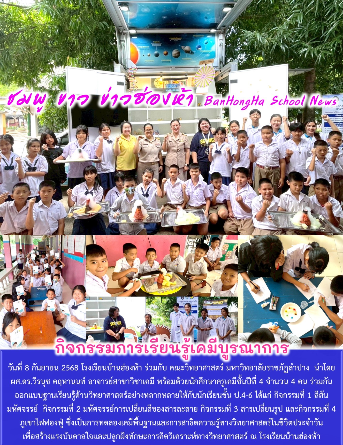 วันที่ 8 กันยายน 2568 โรงเรียนบ้านฮ่องห้า ร่วมกับ คณะวิทยาศาสตร์ มหาวิทยาลัยราชภัฏลำปาง นำโดย ผศ.ดร.วีรนุช คฤหานนท์ อาจารย์สาขาวิชาเคมี พร้อมด้วยนักศึกษาครูเคมีชั้นปีที่ 4 จำนวน 4 คน ร่วมกัน ออกแบบฐานเรียนรู้ด้านวิทยาศาสตร์อย่างหลากหลายให้กับนักเรียนชั้น ป.4-6 ได้แก่ กิจกรรมที่ 1 สีสัน มหัศจรรย์ กิจกรรมที่ 2 มหัศจรรย์การเปลี่ยนสีของสารละลาย กิจกรรมที่ 3 สารเปลี่ยนรูป และกิจกรรมที่ 4 ภูเขาไฟฟองฟู ซึ่งเป็นการทดลองเคมีพื้นฐานและการสาธิตความรู้ทางวิทยาศาสตร์ในชีวิตประจำวัน เพื่อสร้างแรงบันดาลใจและปลูกฝังทักษะการคิดวิเคราะห์ทางวิทยาศาสตร์ ณ โรงเรียนบ้านฮ่องห้า