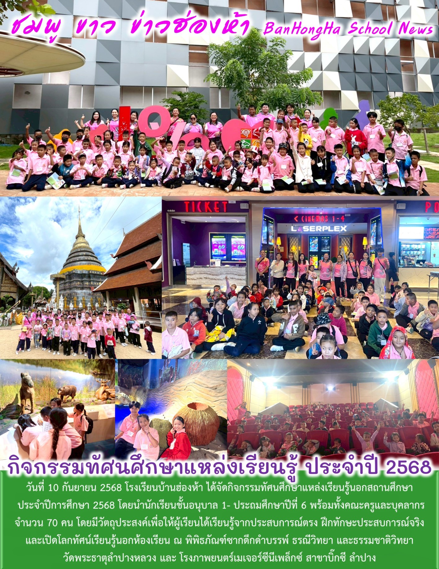 วันที่ 10 กันยายน 2568 โรงเรียนบ้านฮ่องห้า ได้จัดกิจกรรมทัศนศึกษาแหล่งเรียนรู้นอกสถานศึกษา ประจำปีการศึกษา 2568 โดยนำนักเรียนชั้นอนุบาล 1- ประถมศึกษาปีที่ 6 พร้อมทั้งคณะครูและบุคลากร จำนวน 70 คน โดยมีวัตถุประสงค์เพื่อให้ผู้เรียนได้เรียบรู้จากประสบการณ์ตรง ฝึกทักษะประสบการณ์จริง และเปิดโลกทัศน์เรียนรู้นอกห้องเรียน ณ พิพิธภัณฑ์ซากดึกดำบรรพ์ ธรณีวิทยา และธะรรมชาติวิทยา วัดพระธาตุลำปางหลวง และ โรงภาพยนตร์เมเจอร์ซีนีเพล็กซ์ สาขาบิ๊กซี ลำปาง